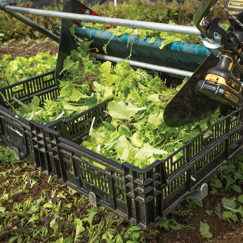 Achieve a higher quality end-product by avoiding damage to baby leaf greens, which is often caused by unnecessary handling. Replaces the harvest bag and mounts behind the harvester. NOTE: Bins not included. Made in France by Terrateck. For the Baby Leaf Harvester #7980.