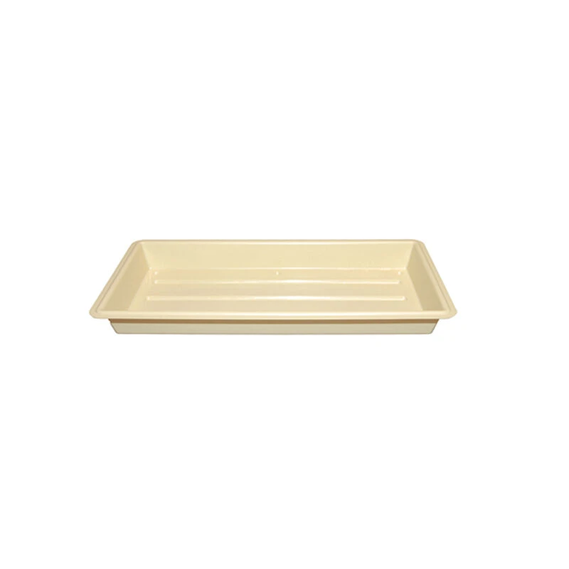 Heavy duty, leak-proof, and stackable. Made of thick-walled polystyrene, these rigid trays are easy to clean and will last for years. May be hot or cold sterilized. Use them to support standard 1020 seedling flats or trays, and plastic or biodegradable pots. Also great for bottom watering. Each tray measures 22″ x 11″ x 2½”. Tan.