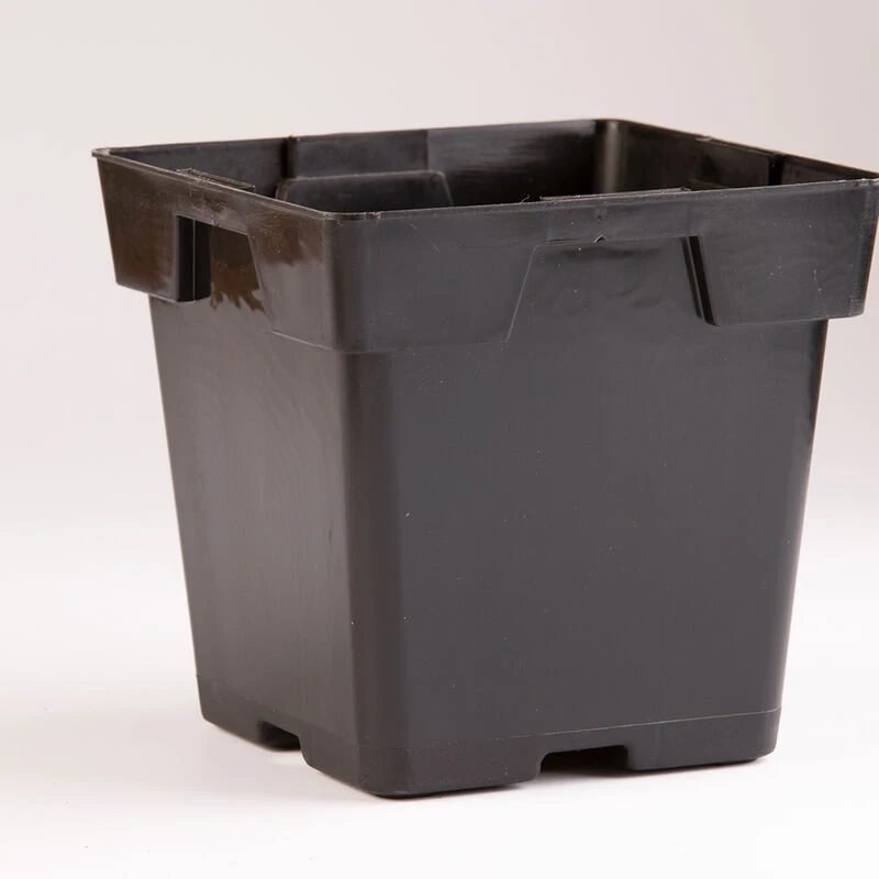 5 1/4″ square by 5 1/2″ deep. 8 pots fit in a standard 1020 tray. With drainage holes.