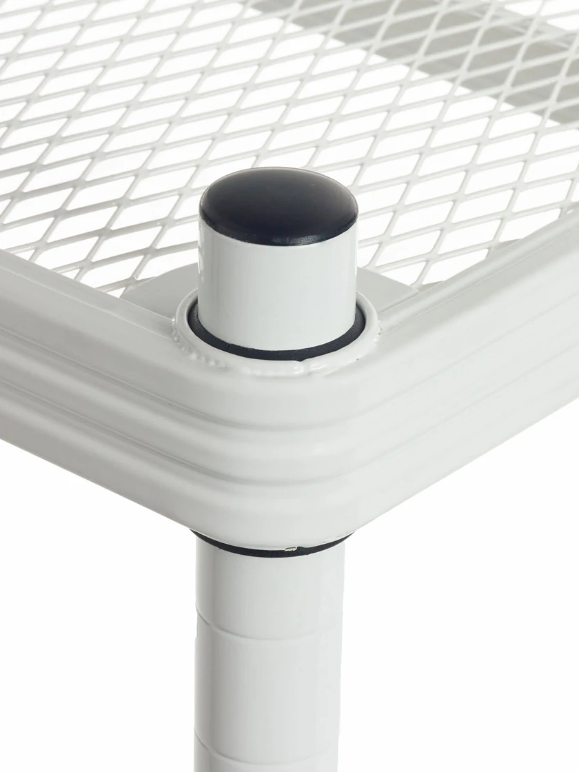 Traditional wire shelves can cause a headache as items can fall through the wide gaps on the shelves. Our brilliantly engineered mesh shelving units use a larger gauge of expanded metal mesh for style, strength and functionality. Each shelf has a weight limit of 440 pounds to safely hold everything from small knick knacks to large, heavy bins. The utility unit includes 4 adjustable shelves, a hook rack with 6 hooks, and a removable wood top work surface. Use in your prep area, the garage or garden shed to organize tools and potting supplies.