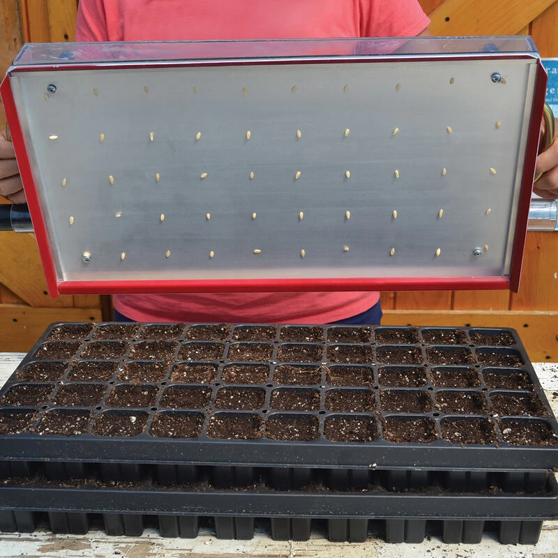 Perfect for small to midsize operations. Directly seeds standard 1020 format plug trays as well as cell packs up to 120 trays per hour with very high accuracy. Transparent seeder body allows for easy inspection for clogged holes and/or misses. Seeds are poured onto the plate and the operator moves them around the pan as vacuum pressure collects seeds at each open hole in the plate. Hold the seeder vertically while lightly bumping the edge against the table until only one seed remains against each hole. Invert the seeder and place over a soil-filled plug tray. Shut the suction valve, releasing all the seeds at once into their respective cells. Includes seeder assembly, seed collection tray and holder, small shop vac, orifice cleaner, and inspection light. Made in the USA. NOTE: Not compatible with plates designed for the Precision Vacuum Seeder for paperpot trays (#7063). Aluminum seed plates for 1020 trays sold separately.