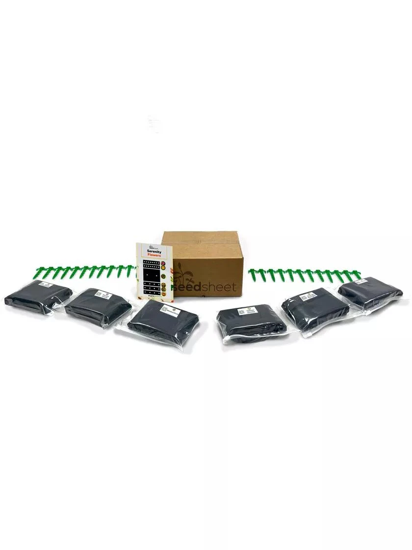 The dissolvable seed pouches are made out of a food-safe polyvinyl alcohol film, most commonly used in gel casings for pills. The permeable weed-blocking fabric keeps weeds at bay without harmful chemicals, and allows for water and air exchange. While sheets arrive in set dimensions, you can easily cut to desired size (just be careful not to cut into seed pouches). Included stakes help to anchor each SeedSheet.