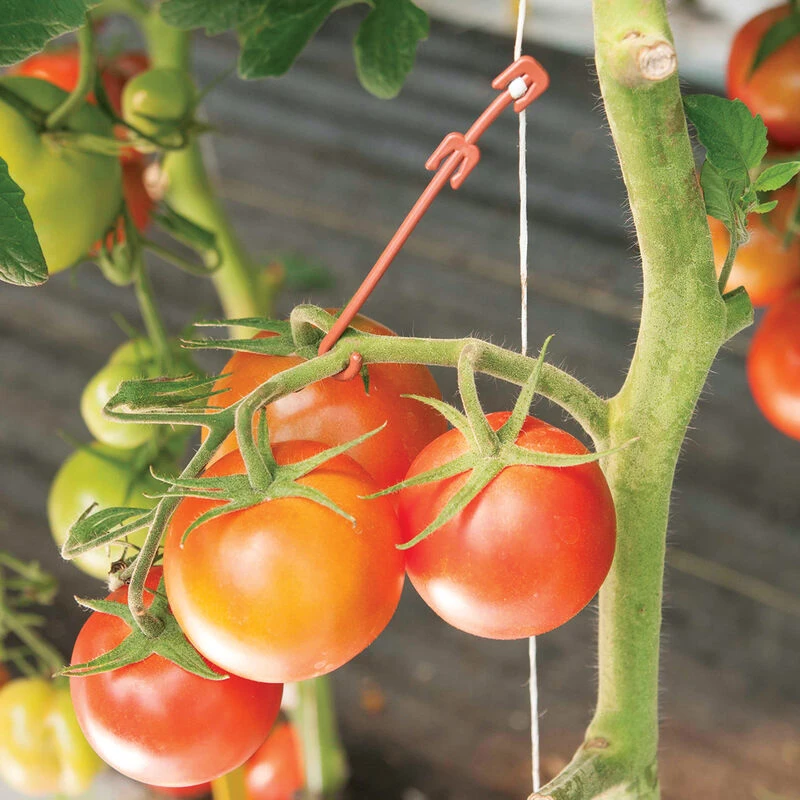 Sturdy polypropylene hooks easily attach to trellis twine to support heavy tomato trusses. Perfect for large-fruiting varieties and heavy producers. Easily adjustable and reusable. Rated to hold up to 20 lb. Approx. 4″ long. 100 count.